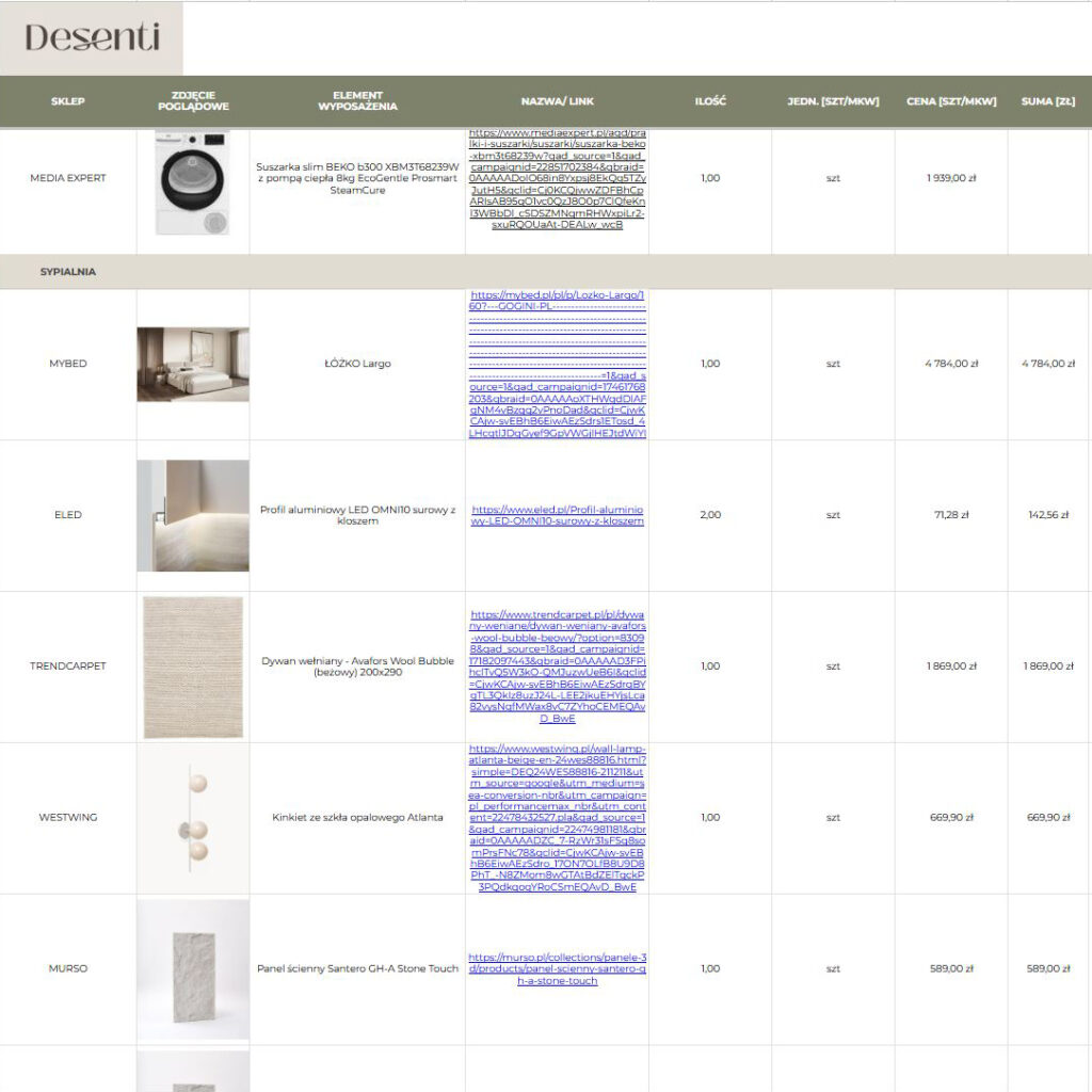 Otrzymujesz jasny i czytelny kosztorys, w formie online do edytowania. Każda pozycja jest dokładnie opisana z linkiem, ceną i ilością. Masz pełną kontrolę nad budżetem  – bez żadnych nieprzewidzianych czy ukrytych kosztów. Cały projekt jesteś w stanie zrealizować w wyznaczonym na początku współpracy budżecie.